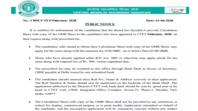 Central Board of Secondary Education (CBSE) has issued an important notice for the candidates who had appeared for the Central Teacher Eligibility Test 2026 (CTET). After declaring the CTET 2026 result, the board has now allowed the candidates to request their calculations along with a copy of the OMR sheet.Candidates who want to get their…